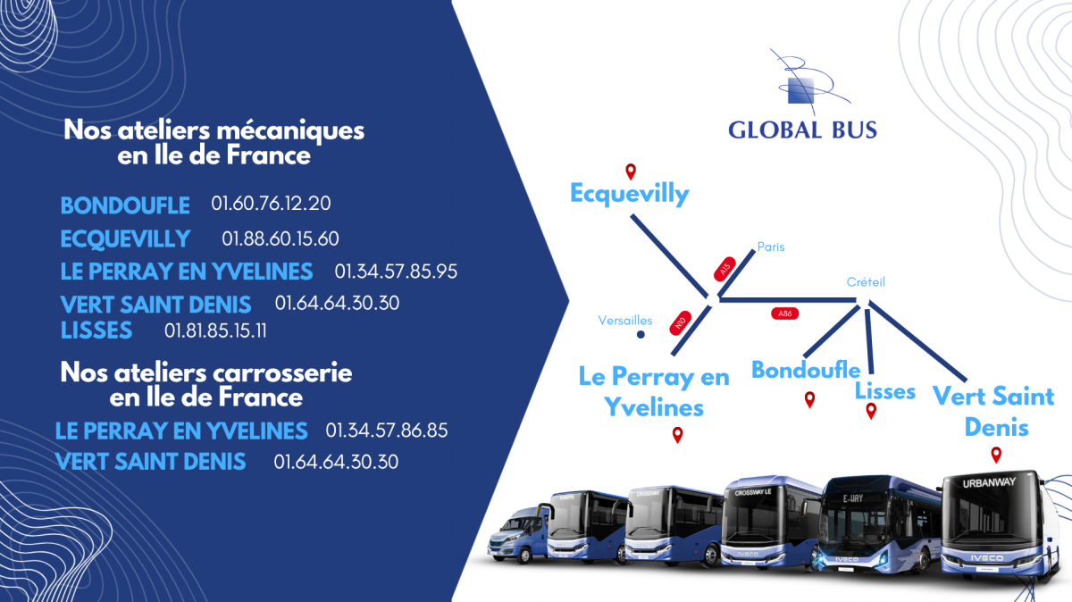 « GLOBAL BUS regroupe 7 établissements Bus en Île‑de‑France, experts en maintenance, réparation et services Iveco Bus pour autocars et autobus. »